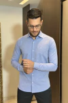 Modelagem slim, colarinho italiano, pequeno detalhe na gola, fechamento por botões com frente invisível, mangas longas com abotoamento nos punhos, logo bordada, pala dupla, detalhes nos punhos e barra arredondada.