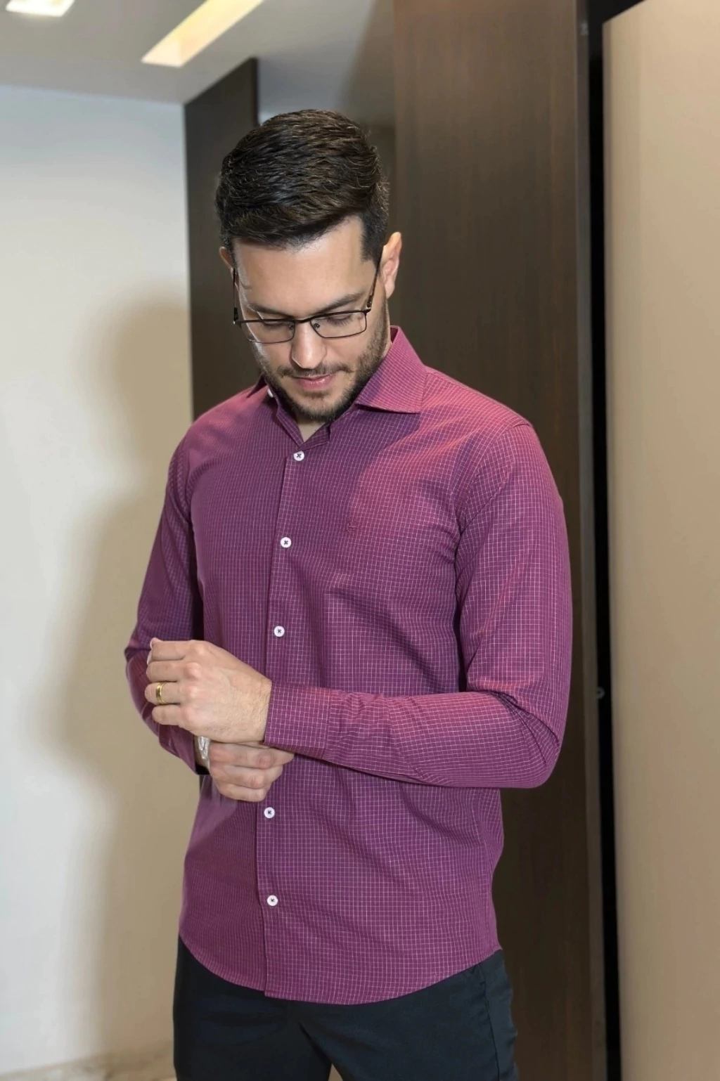 Camisa Social Rosa Manga Longa Slim Xadrez - Ref 1959 -